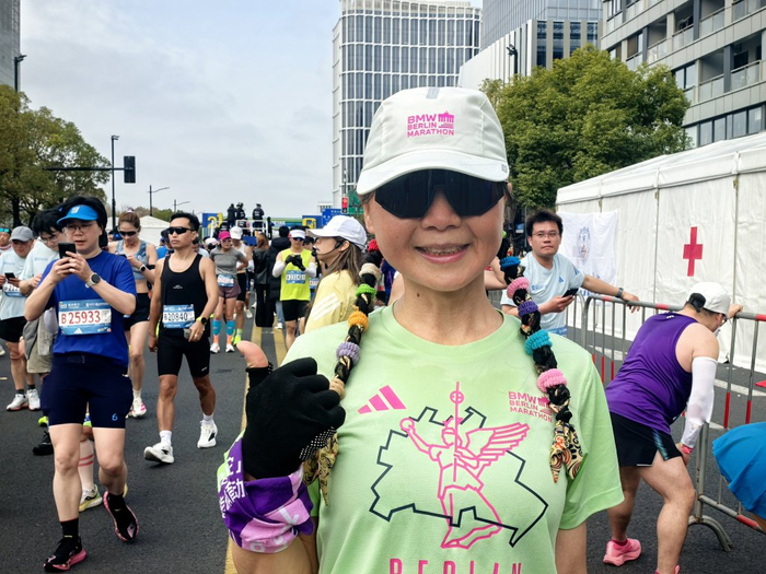 “我跑步不是为了PB,就是为了开心,还有一个目标,就是完成60个马拉松。”虽然成绩上不如年轻人可以一直进步,但是跑步给杨芬带来的健康和活力她更为珍视,对她而言,跑步带来的不仅是健康的体魄,还有一群志同道合的朋友,以及跨越年龄的热爱与活力,在上海半马的终点处,她特意向澎湃新闻记者展示了自己的新发型,“早上起来特意编了一下,编点辫子显年轻。”